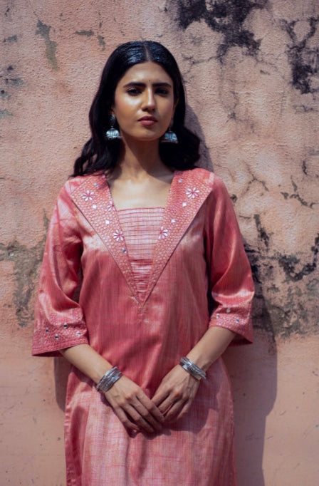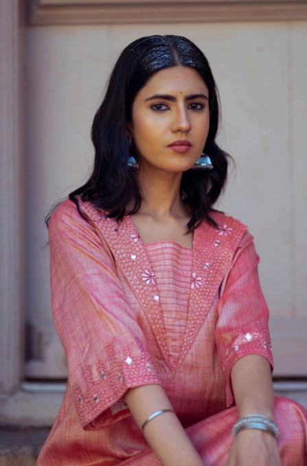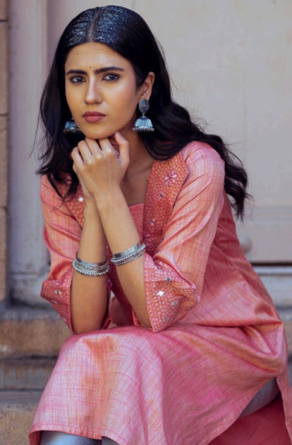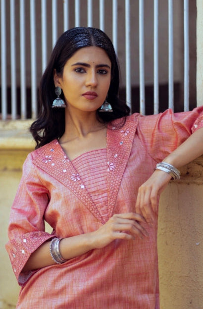 Crafted from soft pastel pink khadi silk, the Zilmil Top is a